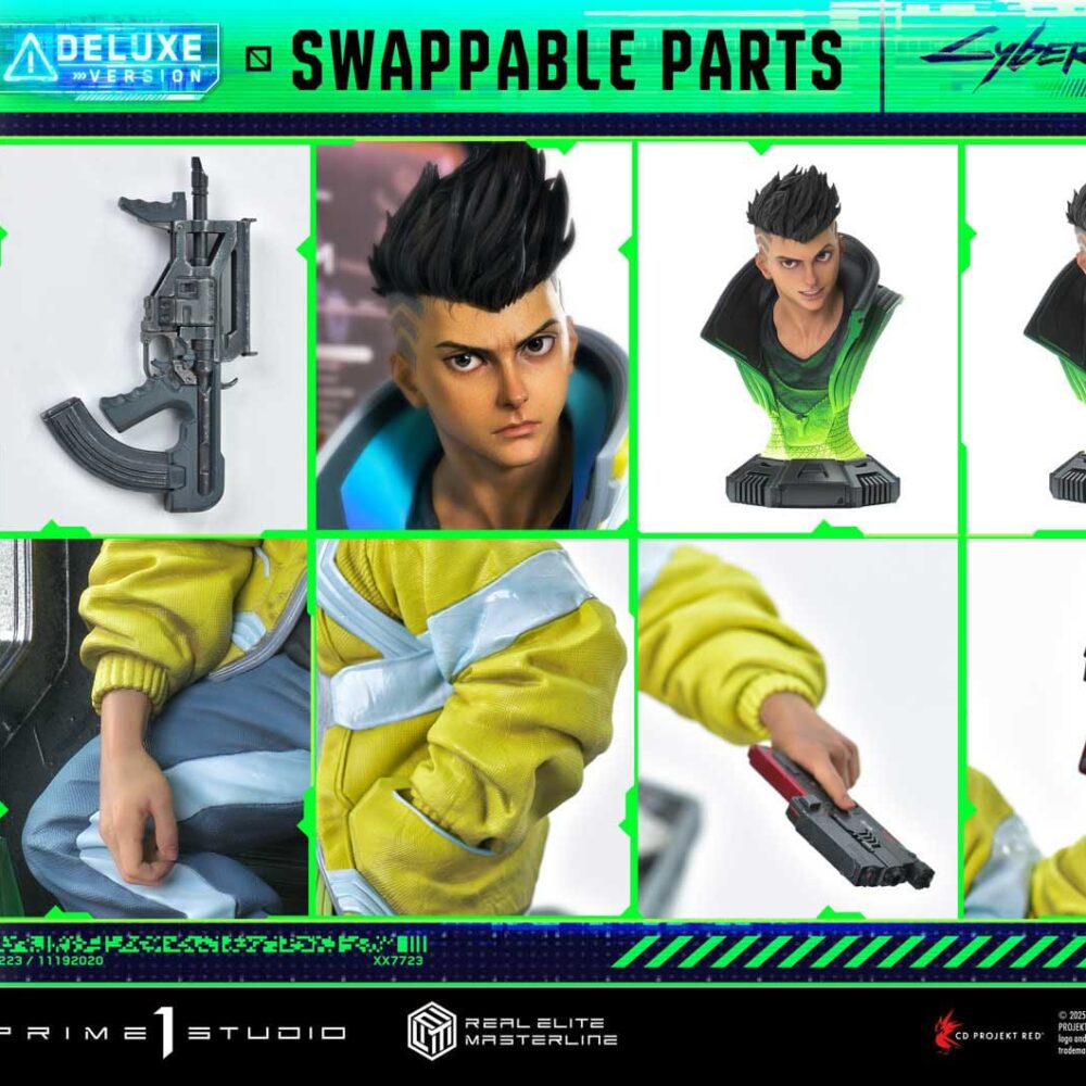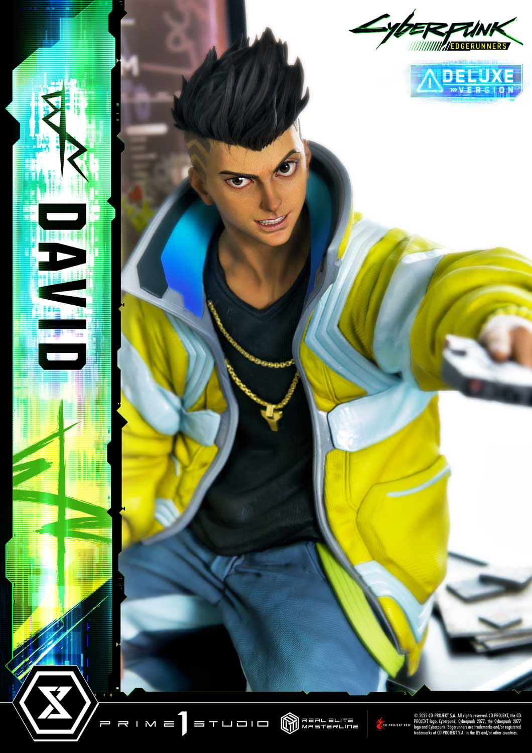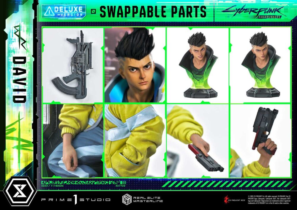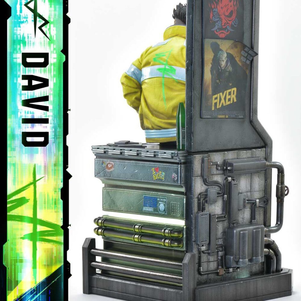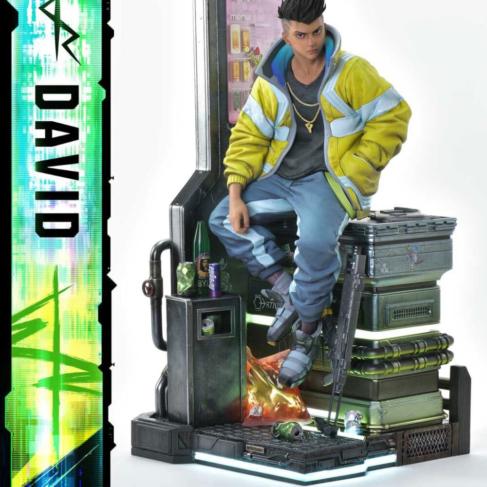 As CD PROJEKT RED Producer Saya Elder highlighted during Prime 1 Studio’s Next Level Showcase XIII, the sculpt and paintwork faithfully reflect the world of “Cyberpunk: Edgerunners”, down to the finest details. The clean line art of David’s side-shaved hairstyle, his expression of ambition and innocence, and his mother’s iconic yellow jacket all incorporate elements of the anime’s design while introducing new layers of appeal.