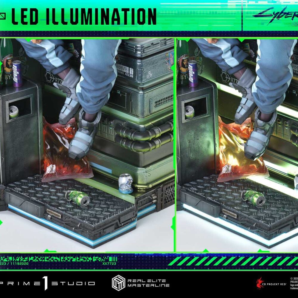 The specially crafted base is inspired by Afterlife, the legendary bar. Neon lights are rendered using LED and reflective paint, combined with weathered stickers and crushed cans to evoke the deep, moody atmosphere of Night City after dark.