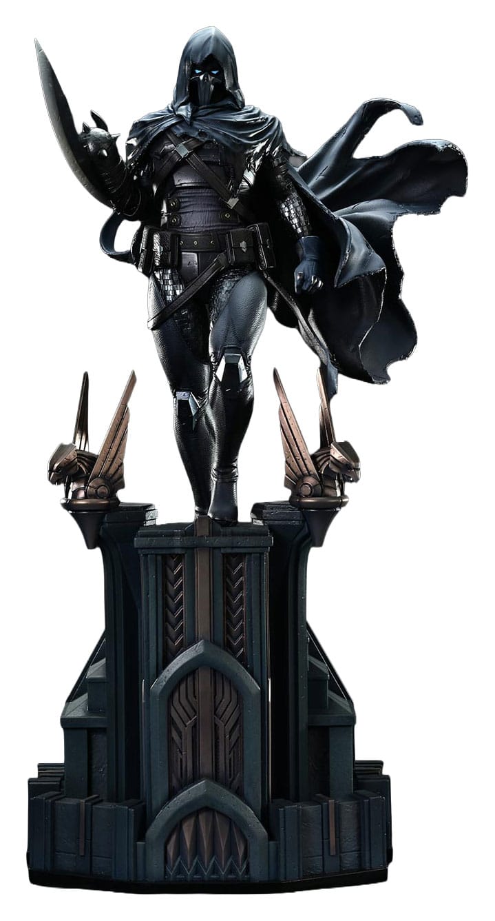 A skull-shaped mask with piercing blue LED-lit eyes, a tattered cloak billowing in the cold Gotham wind, and a ruthless scythe glinting with a dull metallic sheen. Each element of the sculpt and paintwork respects the original design while embracing a realistic tone. The right arm can be swapped to a lowered position, allowing for alternate display options. The specially designed base-adorned with twin gargoyles-intensifies the chilling presence of this formidable figure.