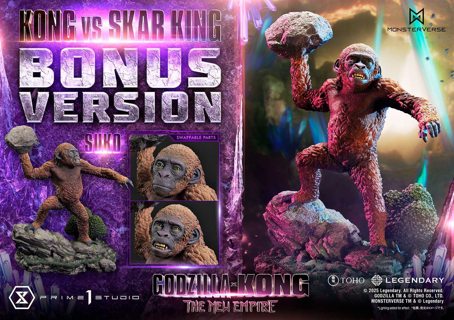The Bonus Version also comes with Kong’s trusted ally, Suko. With a raised boulder in hand and two swappable head parts with different expressions, Suko stands boldly at Kong’s side in the heat of battle.