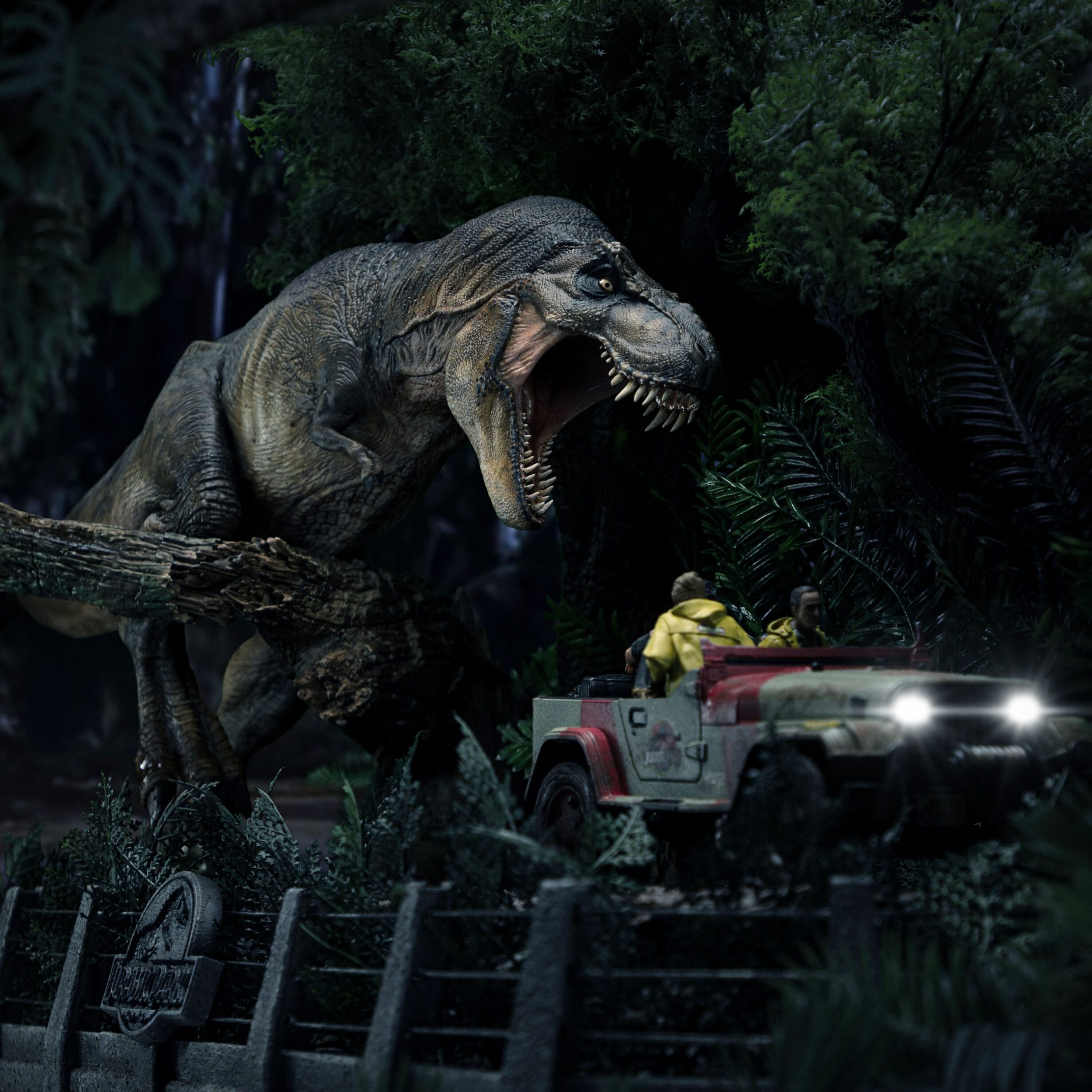 Recreated through genetic engineering as an attraction for a safari-themed zoo park, a massive prehistoric predator escapes the enclosure that restrained it during a storm on the wild Isla Nublar. After attacking the first group of visitors during a test run of the park, the creature returns to the scene of its initial assault, guided by its sharp sense of smell as it detects the presence of new prey. At the site, Dr. Ellie Sattler and the park’s head of security, hunter Robert Muldoon, search for the group and find the injured but surviving mathematician Ian Malcolm. After rescuing him, they place him in their Jeep Wrangler and make a rapid escape, pursued by the largest carnivore to ever walk the Earth. The predator charges through the vegetation, breaking a massive tree trunk in its path with its powerful legs, barely slowing down as it nearly catches its prey. This is one of the most memorable scenes from the 1993 classic film that launched a franchise and continues to captivate audiences worldwide, immortalized on the big screen and now by Iron Studios with the “”T-Rex Chase Scene – Jurassic Park – Demi Scale 1/20″” statue, capturing one of the most thrilling moments featuring the franchise’s most iconic dinosaur, the dinosaur symbol of the franchise, the Tyrannosaurus, or simply T-Rex.